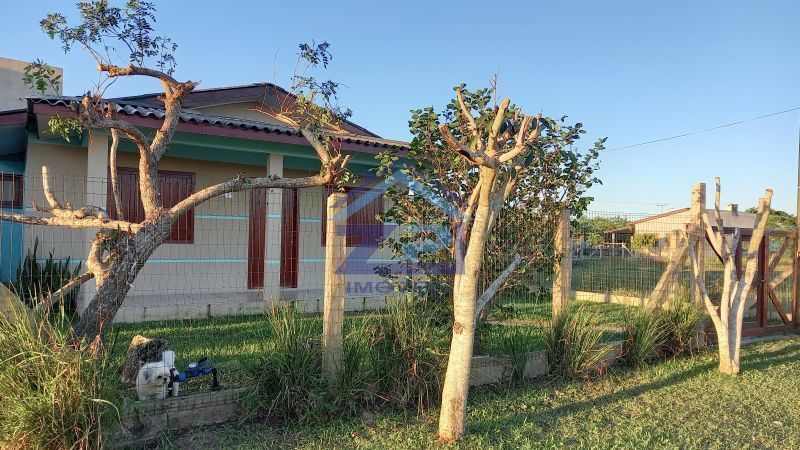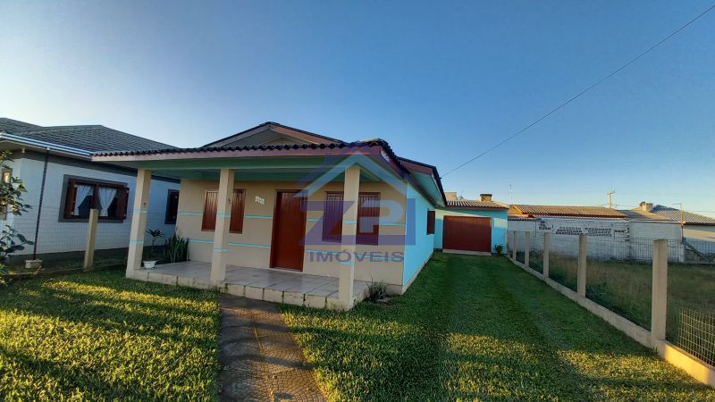 Casa com dois quartos, sala e cozinha conjugadas, lavanderia, banheiro social, área coberta, além de garagem para dois carros, banheiro, e churrasqueira, amplo pátio cercado e gramado.